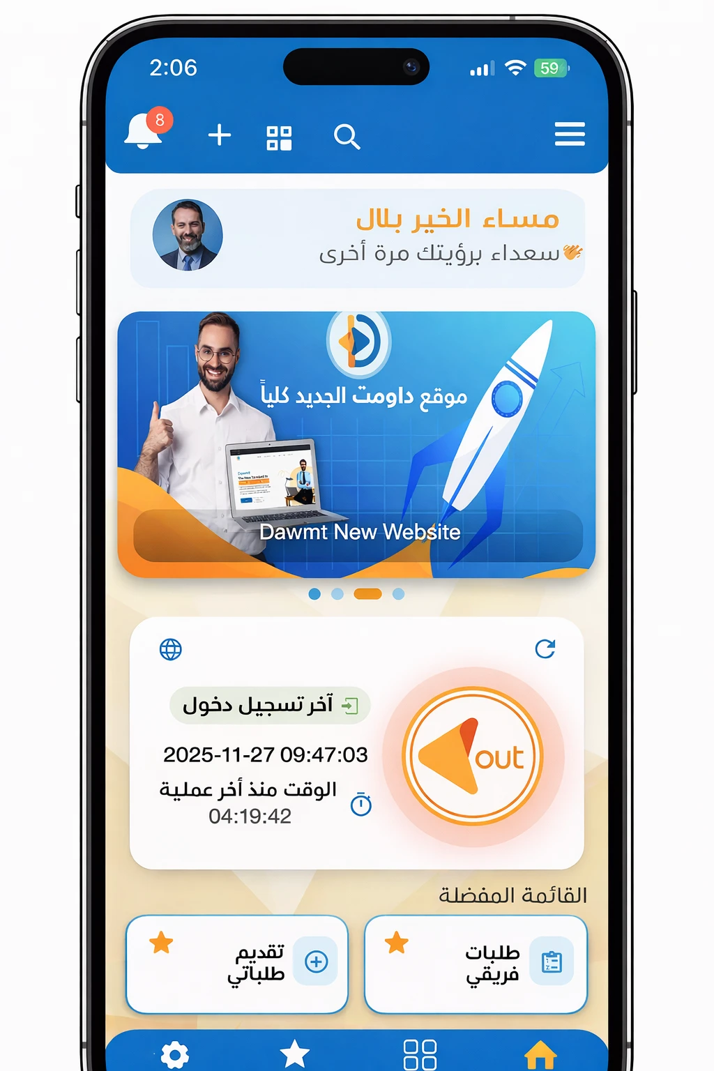 إدارة و تسجيل الحضور والانصراف، عرض تفاصيل سجل الحضور الشهري، عرض جدول المناوبات، طلب تغيير المناوبات، طلب العمل الإضافي، دعم العمل من المنزل, طلب الاستئذان، ...