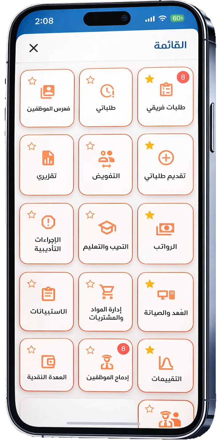 يمكن معالجة طلب: الإجازة، الاستئذان، تغيير المناوبة، العمل إضافي، النفقات، إضافة/تعديل الحضور، تجديد العقد، السفر، التوظيف، التدريب، الشراء، جهاز جديد,...